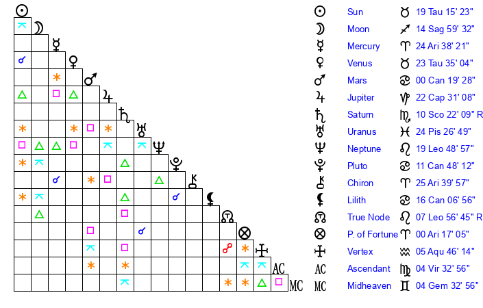 | Venus | 23 Taurus 36 | 6 Aries 20 | 25 Virgo 43 |