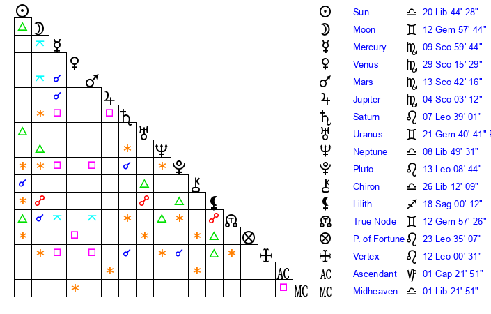 | Moon | 12 Gemini 42 | 3 Leo 23 | 25 Aries 26 |