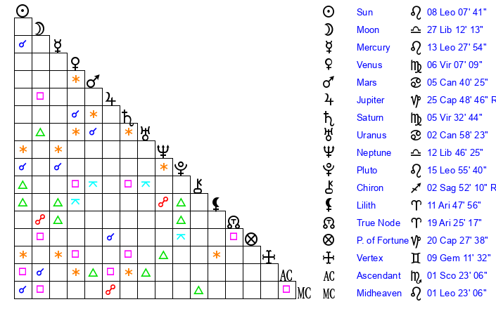 | Moon | 27 Libra 12 | 29 Libra 51 | 28 Cancer 27 |