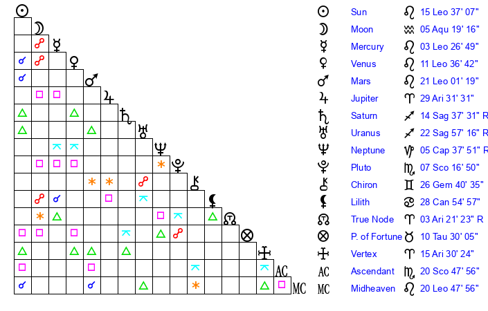 | Moon | 5 Aquarius 16 | 8 Aquarius 41 | 0 Cancer 25 |