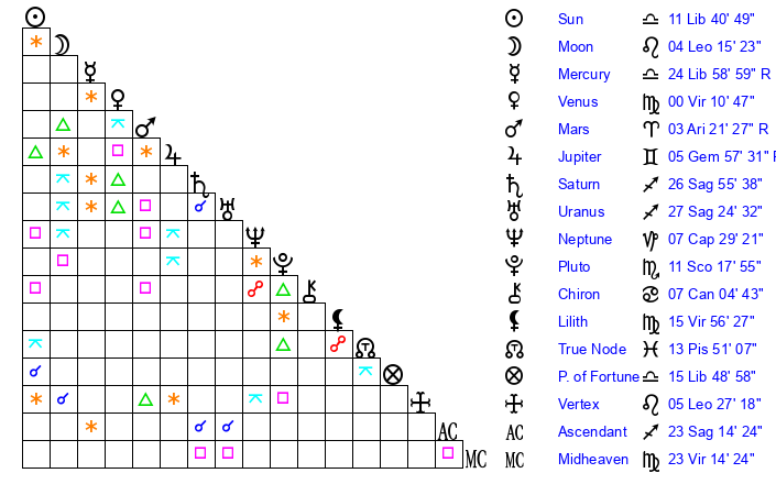 | Moon | 4 Leo 21 | 8 Pisces 37 | 1 Sagittarius 36 |