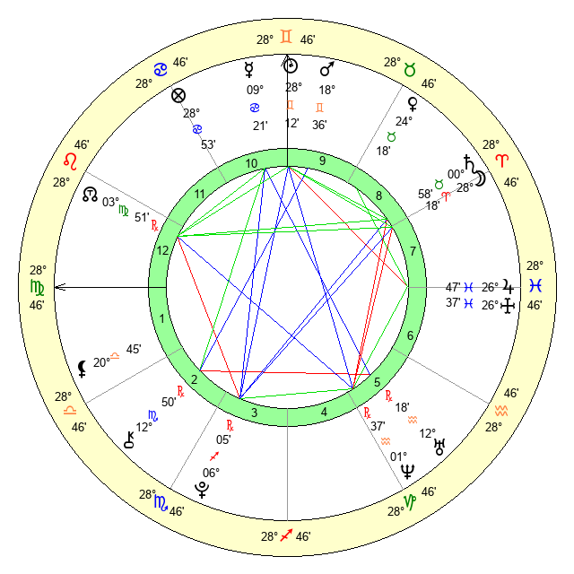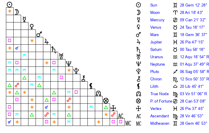 | Sun | 28 Gemini 12 | 28 Gemini 40 | 23 Cancer 57 |
