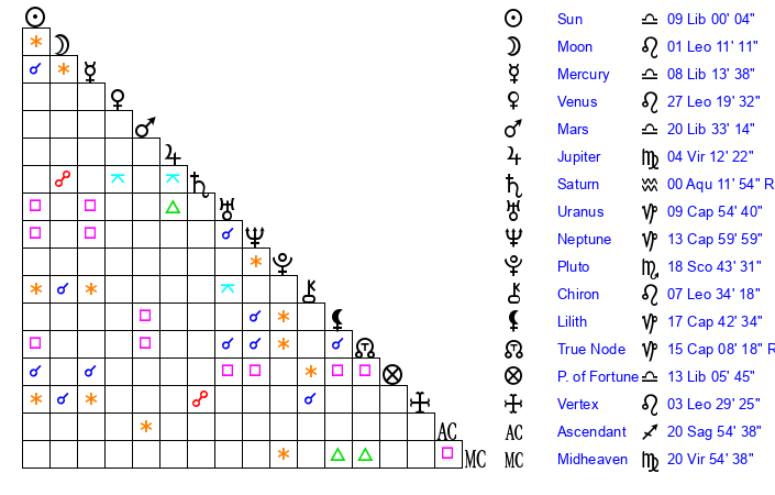 | Moon | 1 Leo 5 | 11 Aquarius 25 | 3 Scorpio 38 |