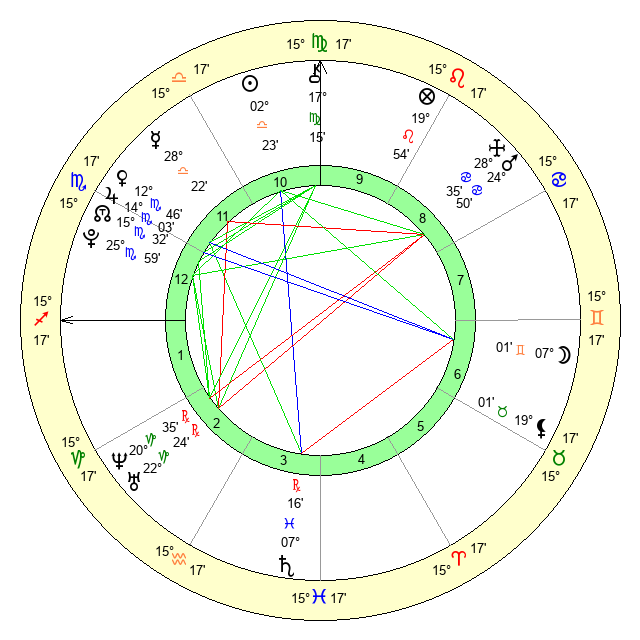 | Moon | 6 Gemini 59 | 15 Scorpio 55 | 21 Cancer 32 |