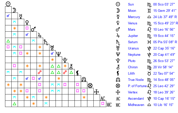 | Venus | 15 Scorpio 49 | 12 Libra 13 | 2 Scorpio 28 |