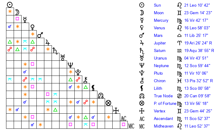 | Neptune | 12 Scorpio 59 | 1 Aries 44 | 14 Scorpio 31 |
