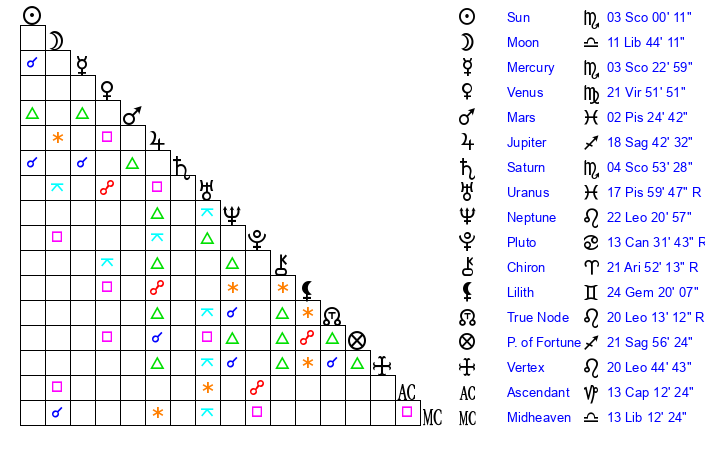 | Sun | 3 Scorpio 0 | 3 Scorpio 32 | 15 Aquarius 23 |