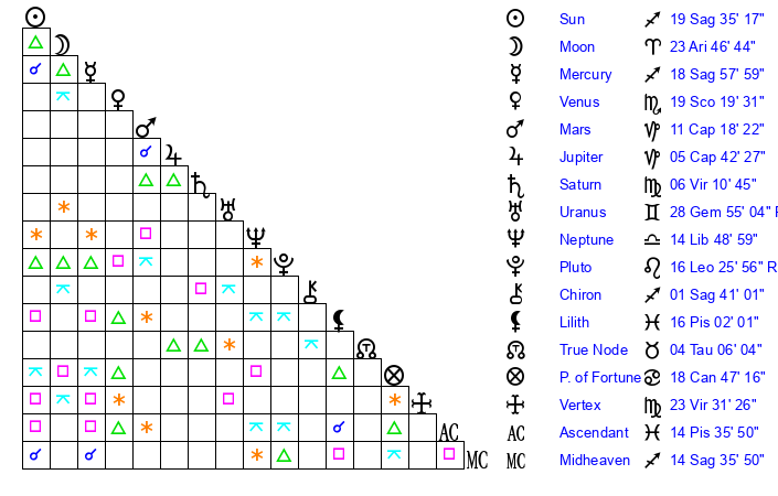 | Neptune | 14 Libra 49 | 29 Pisces 22 | 14 Libra 43 |