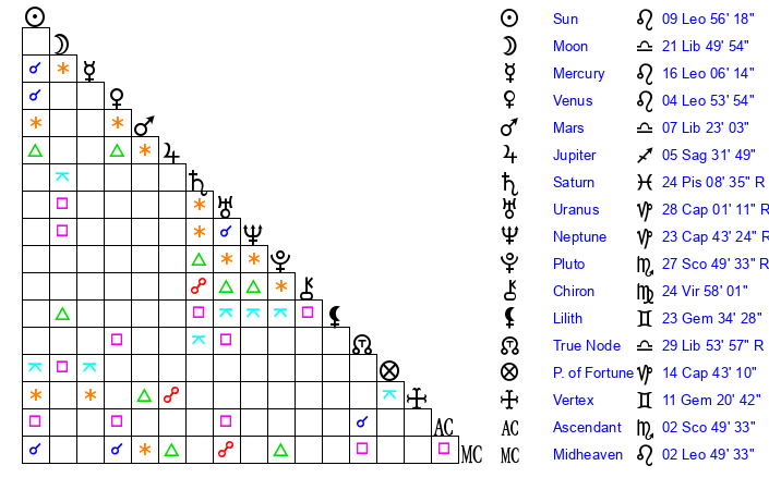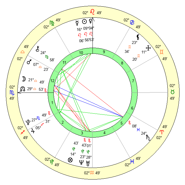 | Moon | 21 Libra 50 | 23 Scorpio 31 | 29 Scorpio 59 |