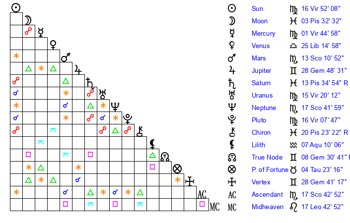 | Sun | 16 Virgo 52 | 17 Virgo 21 | 16 Scorpio 10 |