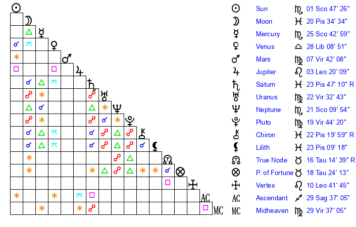 Neptune | 21 Scorpio 10 | 27 Pisces 37 | 23 Scorpio 15 |