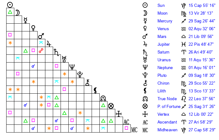 | Saturn | 26 Aries 37 | 14 Pisces 55 | 27 Aries 37 |