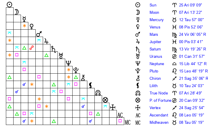 | Sun | 25 Aries 9 | 25 Aries 58 | 7 Cancer 22 |