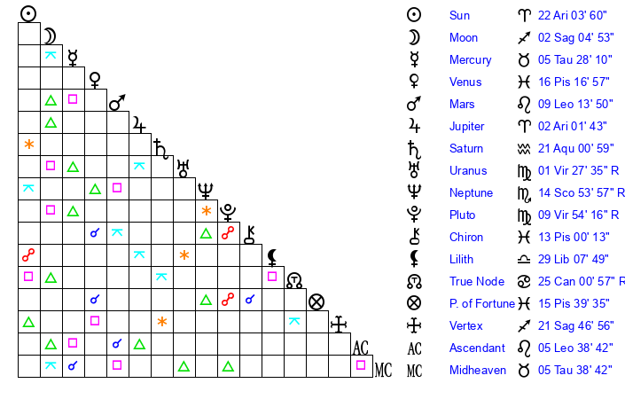 | Sun | 22 Aries 4 | 23 Aries 2 | 21 Gemini 58 |