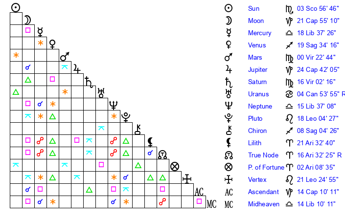 | Sun | 3 Scorpio 57 | 4 Scorpio 32 | 20 Capricorn 55 |