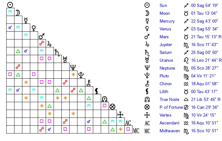 | Sun | 0 Sagittarius 54 | 1 Sagittarius 39 | 9 Aquarius 3 |