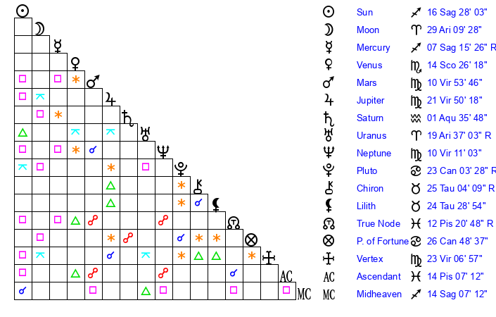 | Sun | 16 Sagittarius 28 | 16 Sagittarius 54 | 20 Pisces 43 |