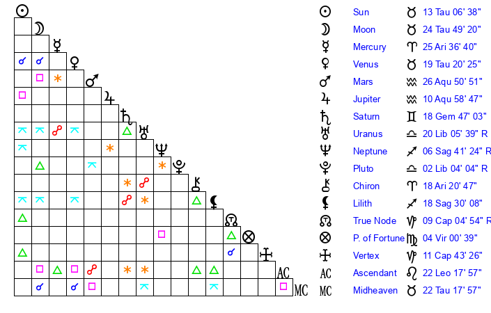 | Sun | 13 Taurus 6 | 13 Taurus 30 | 3 Cancer 1 |