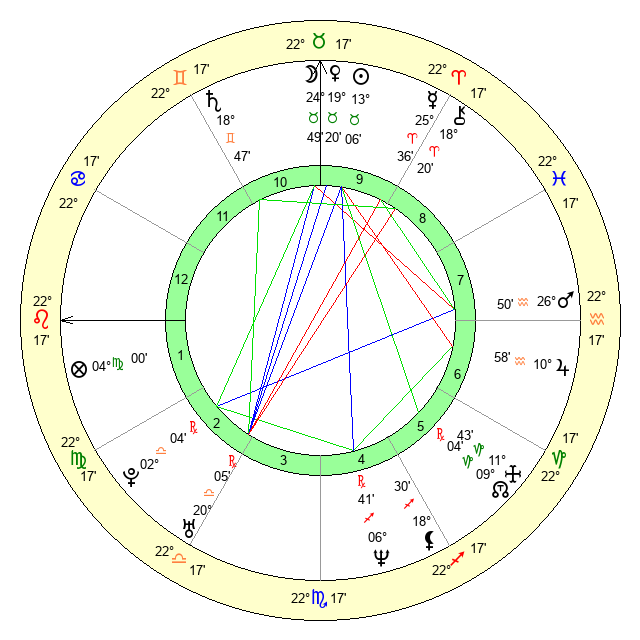 | Moon | 24 Taurus 46 | 3 Leo 9 | 13 Aries 52 |