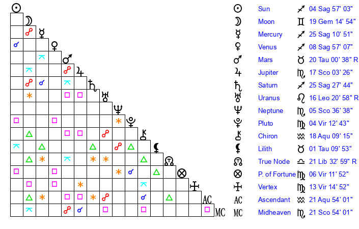 | Moon | 19 Gemini 19 | 28 Aquarius 44 | 8 Sagittarius 9 |