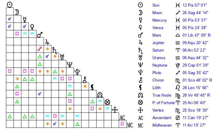 Sun | 12 Pisces 57 | 13 Pisces 9 | 10 Aries 48 |