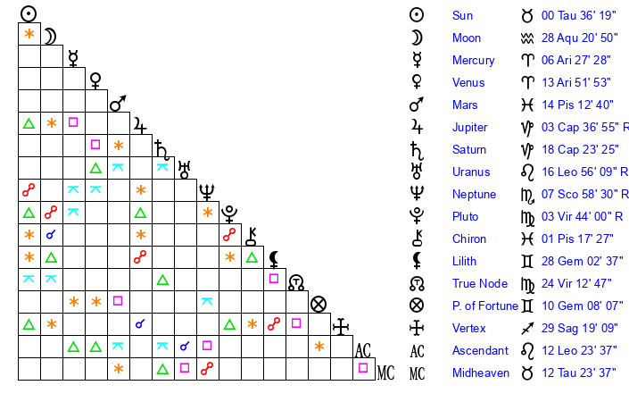 | Uranus | 16 Leo 57 | 25 Taurus 46 | 18 Leo 32 |
