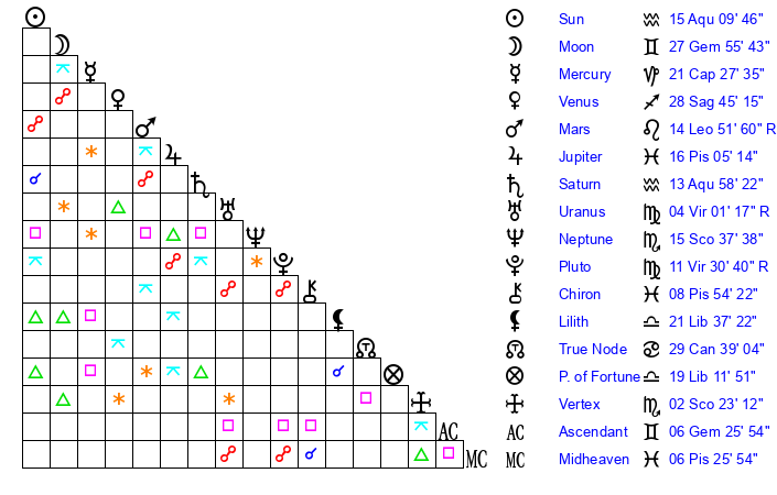 | Saturn | 14 Aquarius 13 | 17 Pisces 46 | 20 Aquarius 51 |