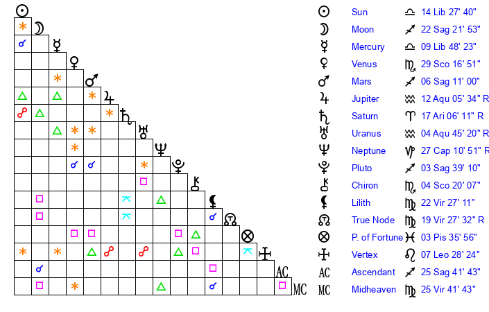 | Venus | 29 Scorpio 17 | 22 Virgo 21 | 29 Sagittarius 20 |