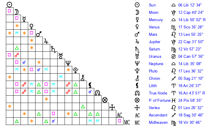 | Mercury | 14 Libra 50 | 19 Libra 7 | 4 Capricorn 53 |