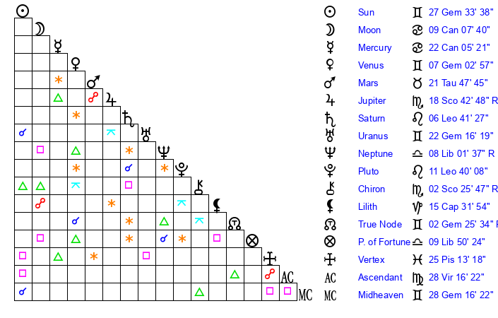 | Sun | 27 Gemini 34 | 28 Gemini 40 | 12 Virgo 17 |