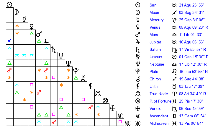 | Sun | 21 Aquarius 24 | 22 Aquarius 12 | 5 Taurus 53 |