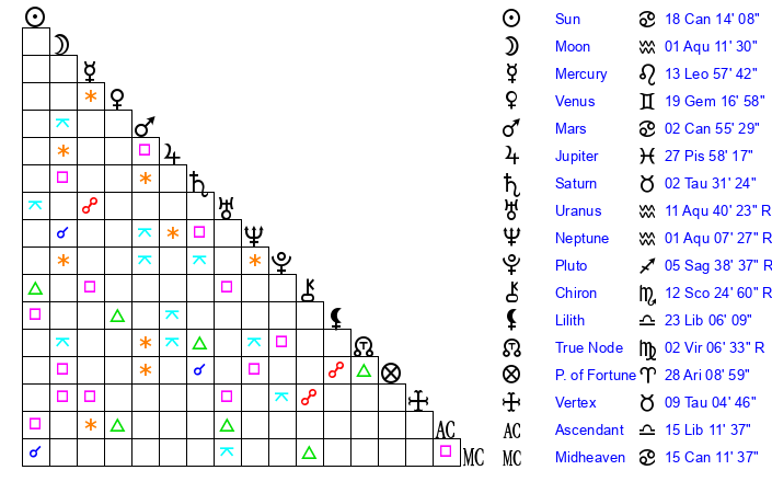 | Uranus | 11 Aquarius 40 | 0 Gemini 10 | 10 Aquarius 37 |