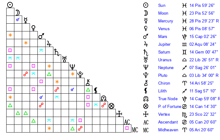 | Moon | 23 Pisces 54 | 2 Gemini 39 | 16 Aquarius 58 |