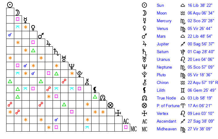 | Sun | 16 Libra 38 | 17 Libra 38 | 22 Sagittarius 58 |