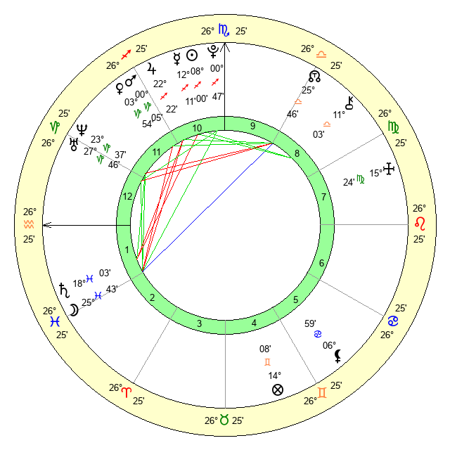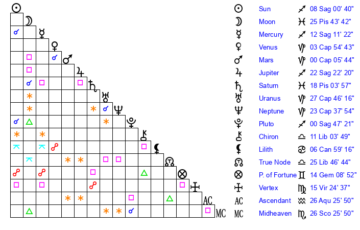 | Moon | 25 Pisces 43 | 2 Sagittarius 41 | 18 Aries 18 |