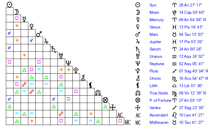 | Sun | 28 Aries 27 | 28 Aries 54 | 24 Taurus 39 |
