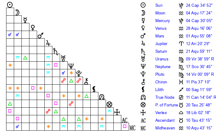 | Pluto | 14 Virgo 0 | 1 Aquarius 31 | 12 Virgo 35 |