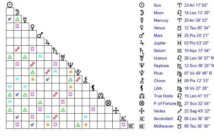 | Sun | 23 Aries 17 | 24 Aries 1 | 24 Gemini 6 |
