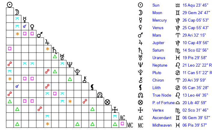 | Sun | 15 Aquarius 23 | 16 Aquarius 8 | 24 Taurus 19 |