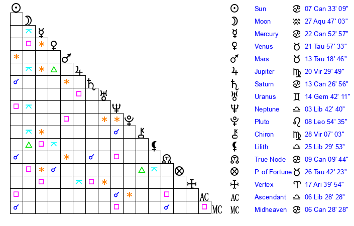 | Mercury | 22 Cancer 54 | 3 Leo 37 | 12 Virgo 1 |