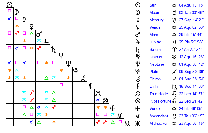 | Uranus | 12 Aquarius 16 | 23 Taurus 17 | 13 Aquarius 47 |