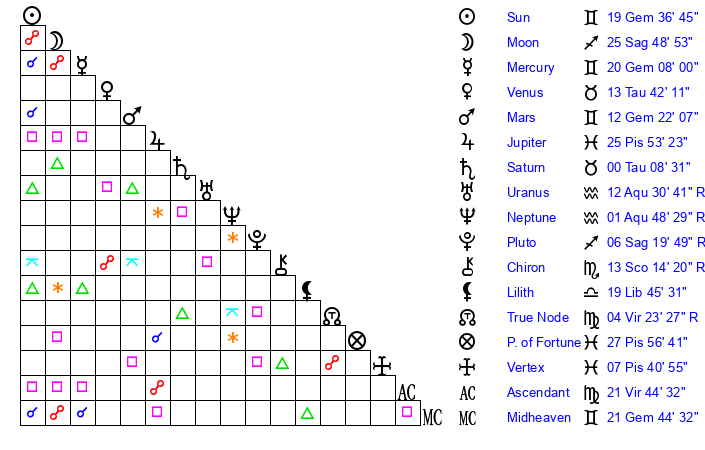 | Moon | 25 Sagittarius 54 | 13 Sagittarius 11 | 21 Sagittarius 44 |