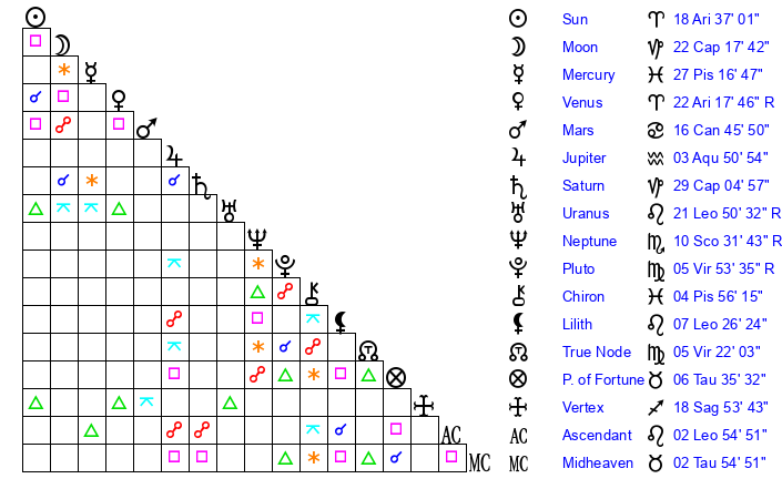 | Venus | 22 Aries 18 | 25 Pisces 1 | 5 Taurus 4 |