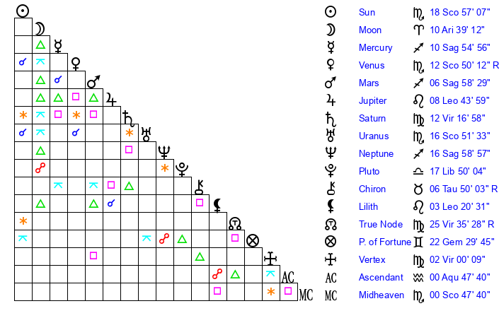 | Sun | 18 Scorpio 57 | 19 Scorpio 33 | 6 Capricorn 36 |