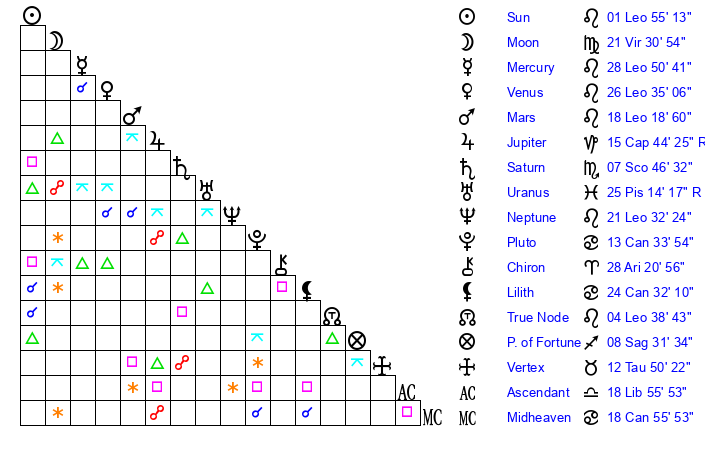 | Mercury | 28 Leo 51 | 13 Leo 30 | 25 Scorpio 6 |