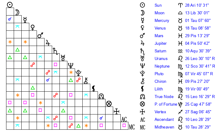 | Sun | 28 Aries 11 | 28 Aries 54 | 28 Gemini 52 |