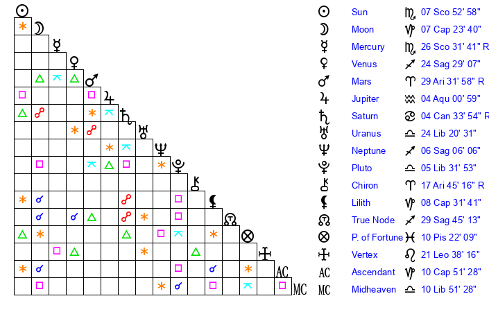 | Sun | 7 Scorpio 53 | 8 Scorpio 16 | 0 Capricorn 27 |