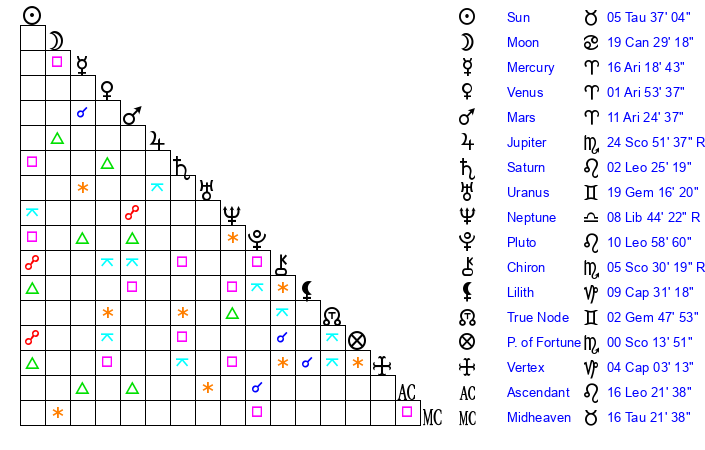 | Moon | 19 Cancer 34 | 21 Aries 2 | 18 Taurus 33 |