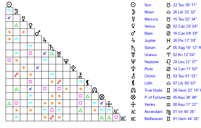 | Moon | 26 Libra 34 | 13 Sagittarius 17 | 4 Gemini 25 |