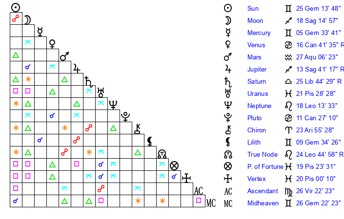 | Jupiter | 13 Sagittarius 25 | 1 Cancer 34 | 13 Sagittarius 24 |